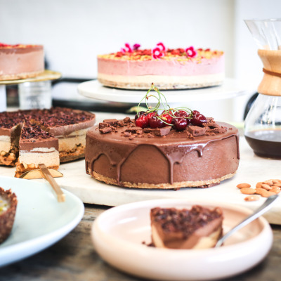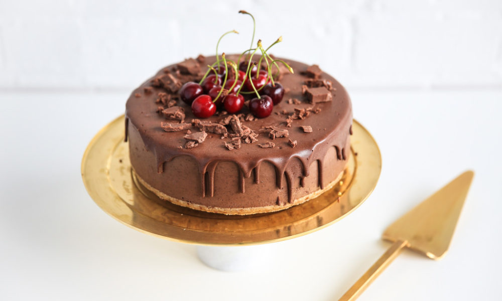This beautiful Christmas cake will really be the cherry on top of your Christmas celebration. A smooth, decadent filling topped with a crunchy raw chocolate coating, followed with extra chocolate shards, topped with cherries.