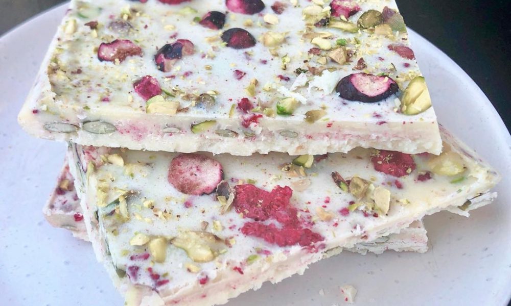 White Chocolate Bark Stevia erythritol, cocoa butter, pumpkin seeds, pistachio, desiccated coconut, coconut milk powder, sunflower lecithin, freeze-dried blueberry, freeze-dried raspberry, vanilla.