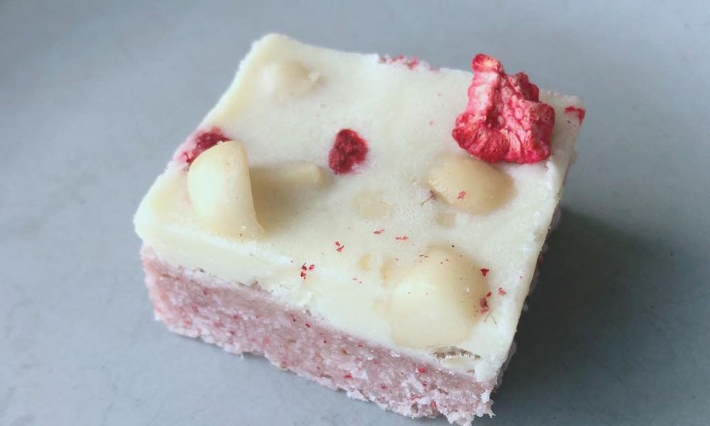 Raspberry Bar Macadamia, coconut milk powder, coconut flour, desiccated coconut, coconut oil, vanilla, stevia erythritol, freeze-dried raspberry, coconut cream