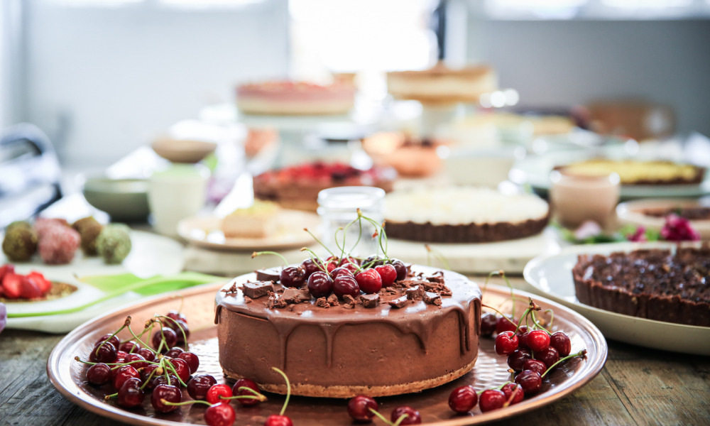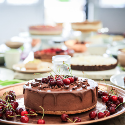 This beautiful Christmas cake will really be the cherry on top of your Christmas celebration. A smooth, decadent filling topped with a crunchy raw chocolate coating, followed with extra chocolate shards, topped with cherries.