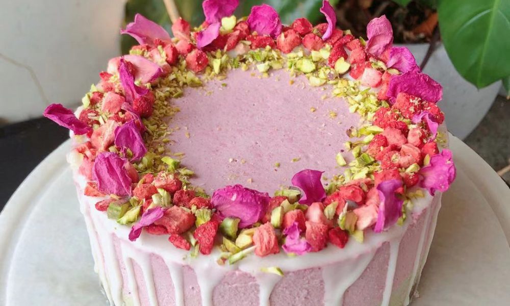Ingredients: Strawberry, rhubarb, cashews, matcha, rose water, brown rice syrup, coconut cream, coconut oil, desiccated coconut, sunflower seeds, dates, coconut milk powder, freeze-dried strawberries, pistachios, psyllium husk.